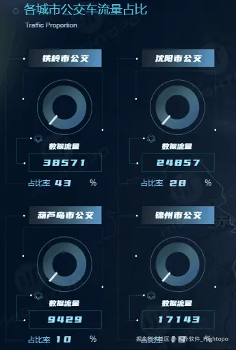 通过量化公交车流量并实时监控各城市公交系统负荷,页面提供动态的运营概览。利用图扑的 2D 可视化图表组件展示各城市公交数据量比重。 数据占比越高,表明该城市在省级网络中承担更多任务。