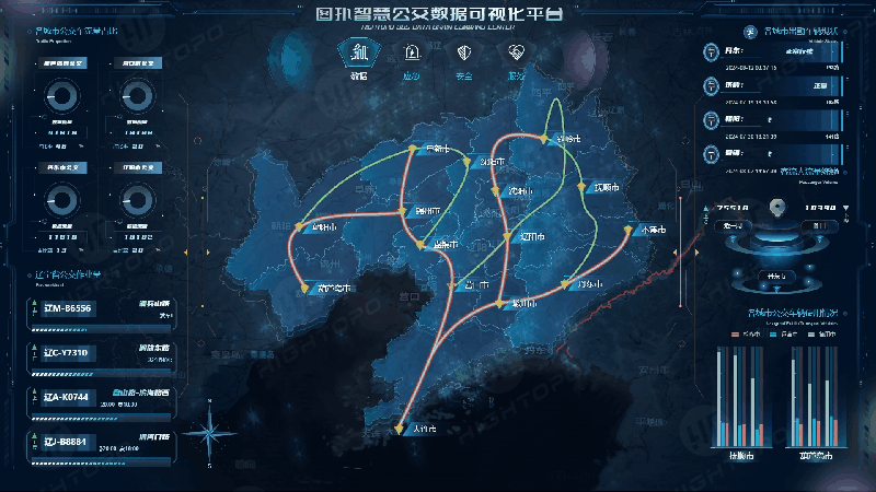页面中央展示了辽宁省各城市的公交轨迹线路图。图扑 HT 以流光效果实时呈现各城市公交主要线路,让用户一目了然掌握整体情况,同时提供全域线网优化解决方案,为公交企业制定线网的顶层规划。用户可点击各城市板块,实时查看该城市的当前营收金额和正在运行的公交车数量,深入了解每个城市的公交运营状况。