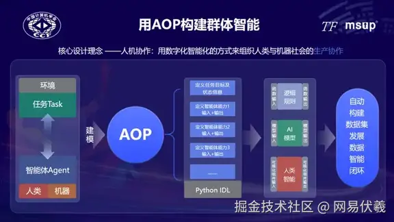 基于智能体视角,网易伏羲提出了 AOP(Agent-Oriented-Programming)面向智能体编程新范式,作为一种用来向智能体描述任务的领域特定语言(DSL),AOP 使得智能体能够在解决问题的过程中不断学习和进化,形成自我增强的闭环系统。 “机器的智能需要人类来提携,人类的智能需要机器来辅助” ,范长杰博士强调,AOP 的核心设计理念是 “人机协作”,旨在用数字化、智能化的方式组织人类与机器社会的生产协作。