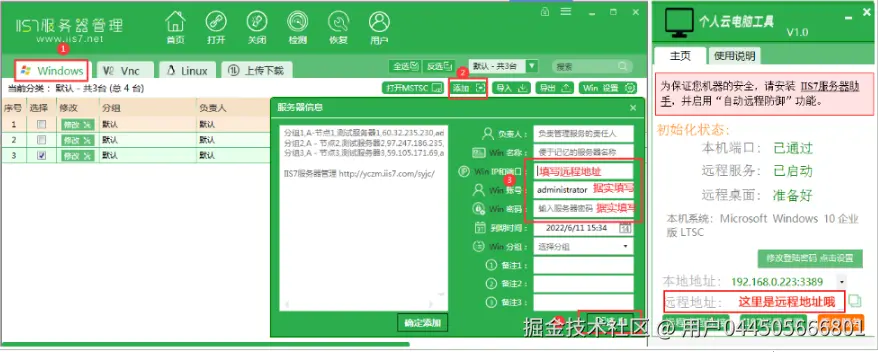 1.可以直接使用本地电脑自带的mstsc工具进行远程。电脑左下角,点击搜索,输入“mstsc”回车即可找到远程桌面连接,点击打开,接下来按提示输入远程电脑中“个人云电脑工具”提供的远程地址,以及远程电脑的用户名,电脑的密码进行远程连接。如下图所示: