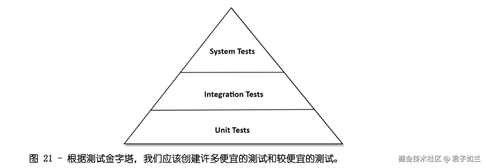 让我们沿着图 21 中的测试金字塔 22 开始讨论测试,这是一个比喻,帮助我们决定应该进行多少种类型的测试。