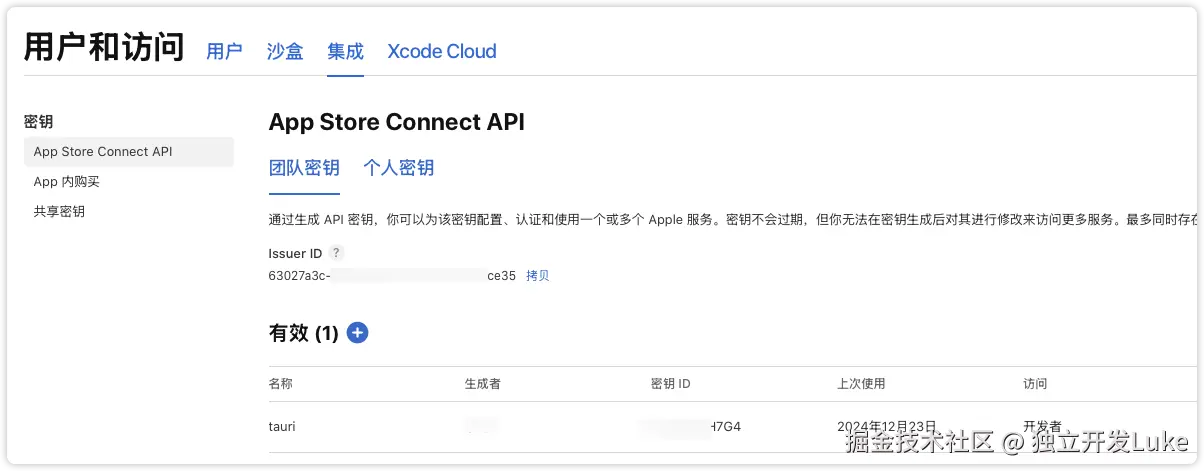 我们选择 App Store Connect API 的方式,创建API key 的页面的进入路径是: App Store Connect → 用户和访问 → 集成,如下图。创建的是团队密钥,不是个人。创建后下载,只能下载一次,所以要保存好,下载后最好不要修改文件名,因为文件名 AuthKey_keyID.p8 包含了key ID,通过文件名可以知道是哪个 API key 。