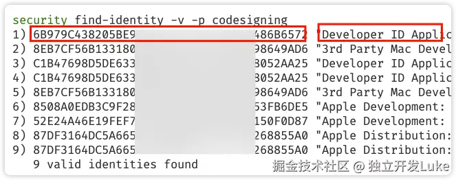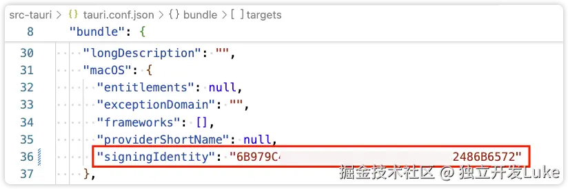 先用 security find-identity -v -p codesigning 命令查看一下本地安装的证书,如果有 Developer ID Application 类型的,复制一下ID,然后放到 tauri 配置中,如果没有请先用自己的apple 开发账号,生成证书,下载到本地并双击导入,然后运行命令,查看证书的ID