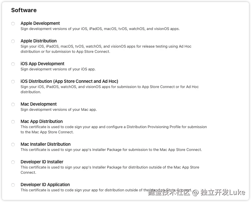 在 macOS 上,App 公正 分两种,一种是 在App Store 中的,一种是在App Store 外的,今天主要介绍 App Store 外的 ,App 公正(notarize) 前要签名,AppStore 外的 用 Developer ID Application ,开发证书有很多种,下图是所有的证书种类,今天只用 Developer ID Application 。