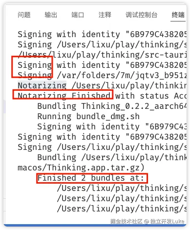 下载 P8文件后,把APPLE_API_ISSUER、APPLE_API_KEY 和 APPLE_API_KEY_PATH 设置到环境变量中,APPLE_API_ISSUER 一个账户只有一个,APPLE_API_KEY 下载文件的文件名后半部分就是 API Key。APPLE_API_KEY_PATH 是p8文件的绝对路径。设置完环境变量,然后运行 tauri build,效果如下