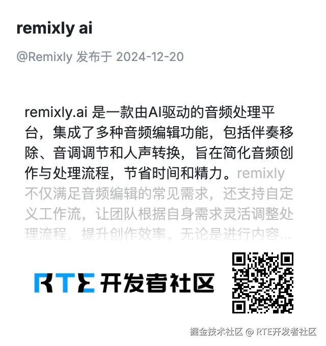 remixly.ai 是一款由 AI 驱动的音频处理平台,集成了多种音频编辑功能,包括伴奏移除、音调调节和人声转换,旨在简化音频创作与处理流程,节省时间和精力。remixly 不仅满足音频编辑的常见需求,还支持自定义工作流,让团队根据自身需求灵活调整处理流程,提升创作效率。无论是进行内容生产,甚至是构建自己的音频应用,remixly 都能提供高效的支持。
