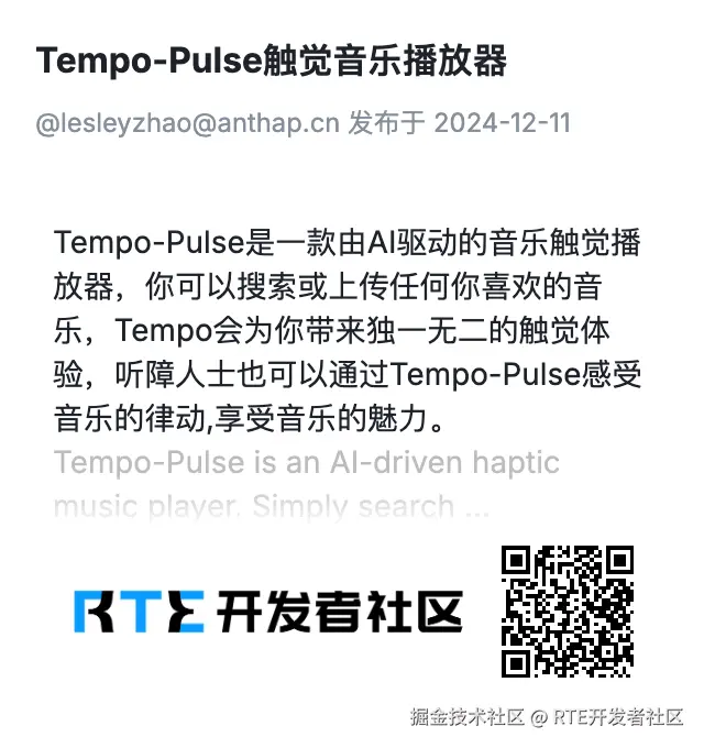 Tempo-Pulse 是一款由 AI 驱动的音乐触觉播放器,你可以搜索或上传任何你喜欢的音乐,Tempo 会为你带来独一无二的触觉体验,听障人士也可以通过 Tempo-Pulse 感受音乐的律动,享受音乐的魅力。