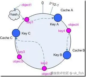 然后把cache节点也用同样的hash方法,映射到圆上,然后每个刚才hash过的value顺时针寻找离自己最近的节点,这个节点就是存储它的节点。