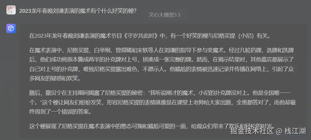 还是比较精准的回答了这个梗,当然如果不加2023年的话其他AI产品还会出来比较旧的结果,new bing依然会给出最近的结果。
