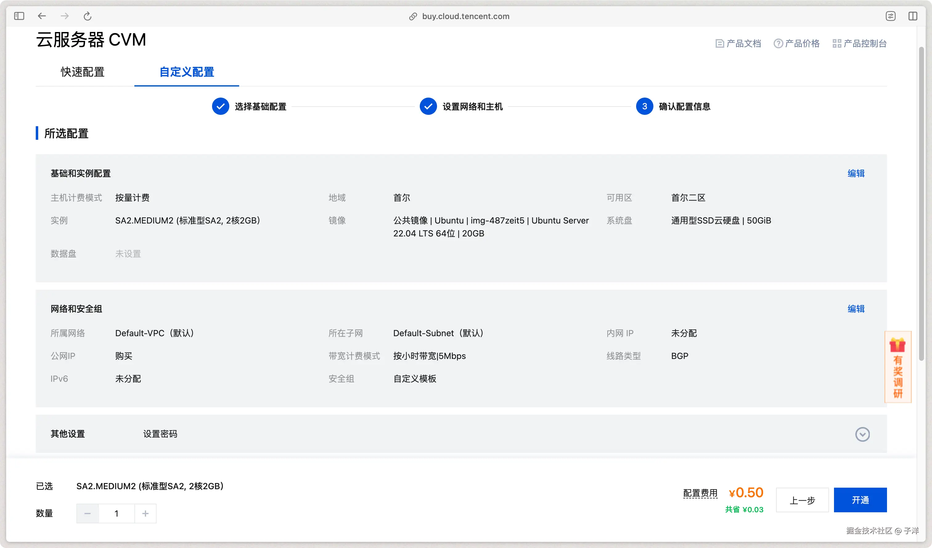 确认最终配置后即可开通服务器。以下是示例配置: