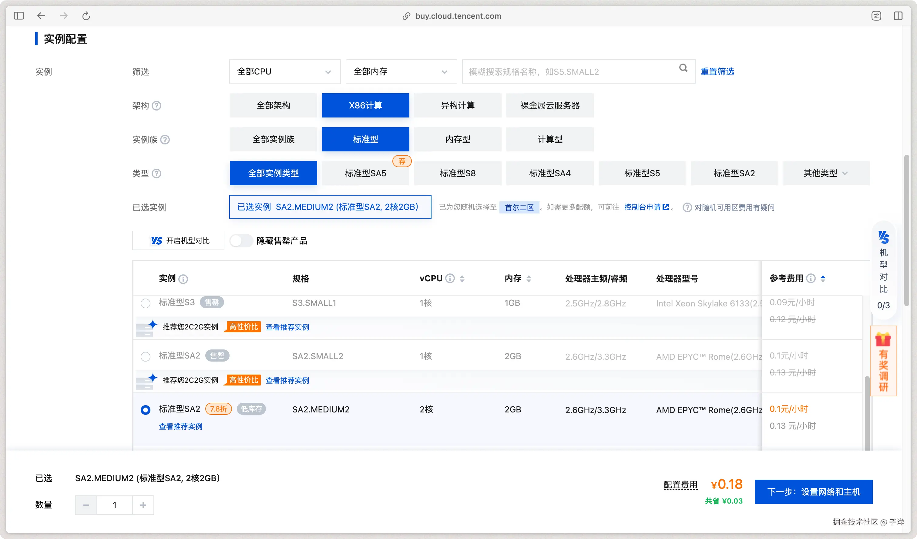 由于我们的需求仅限于外网访问和资源下载,服务器性能需求不高,完全可以选择最低的配置。比如,腾讯云提供的 2核2G 方案,按小时计费,每小时仅需 0.1 元。