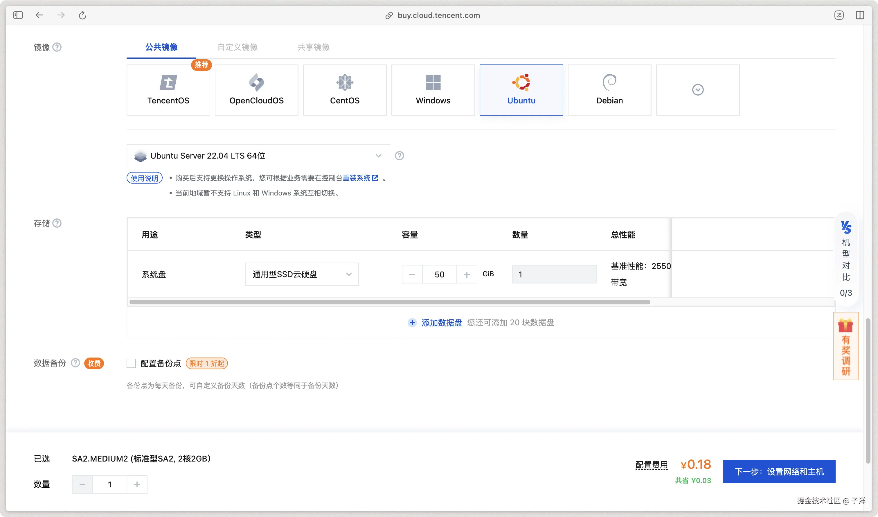 根据自己的偏好选择操作系统镜像。一般情况下,推荐选择轻量级的 Linux 系统(如 CentOS、Ubuntu)。配置较低的服务器不建议选择 Windows 系统,因为其资源占用较高。