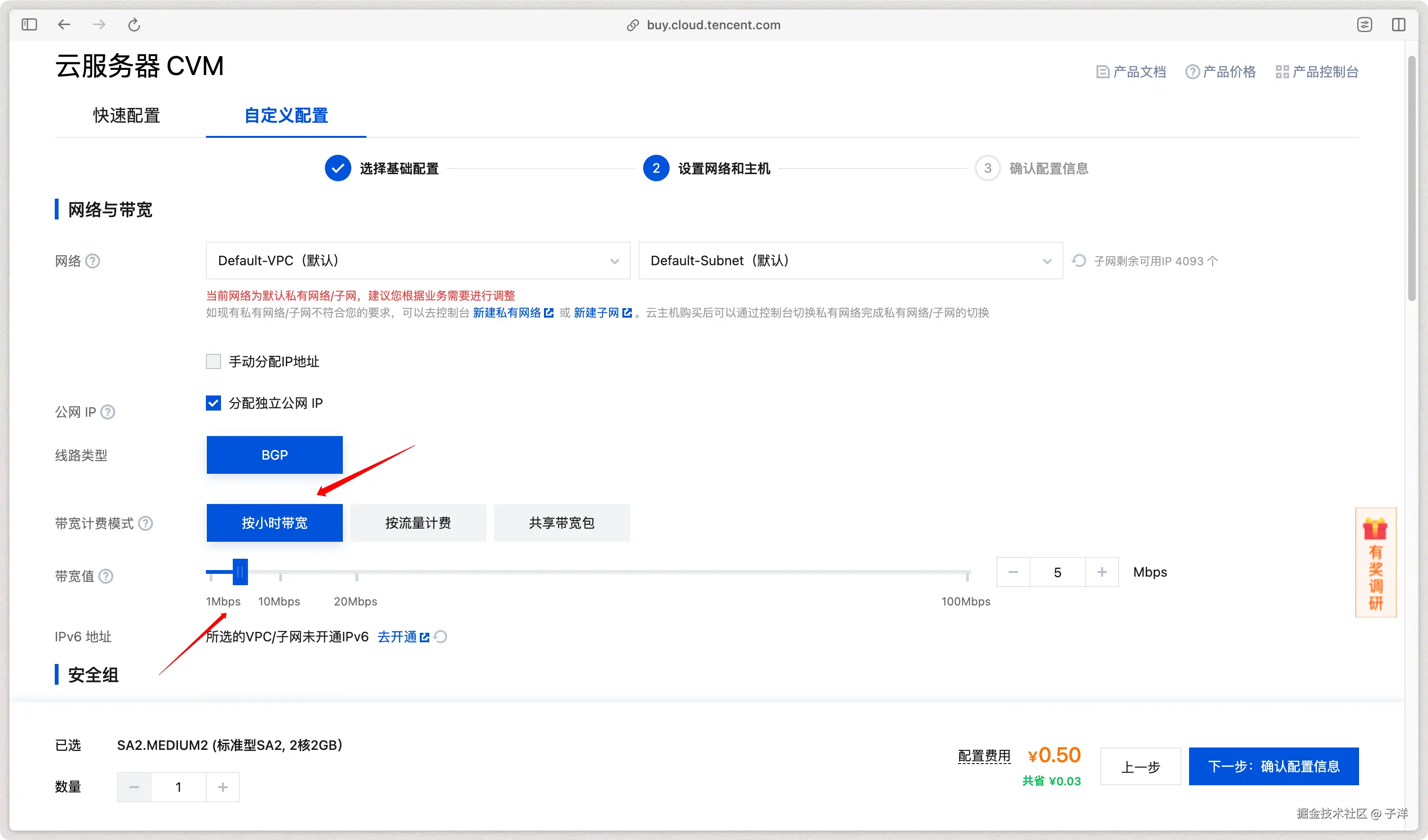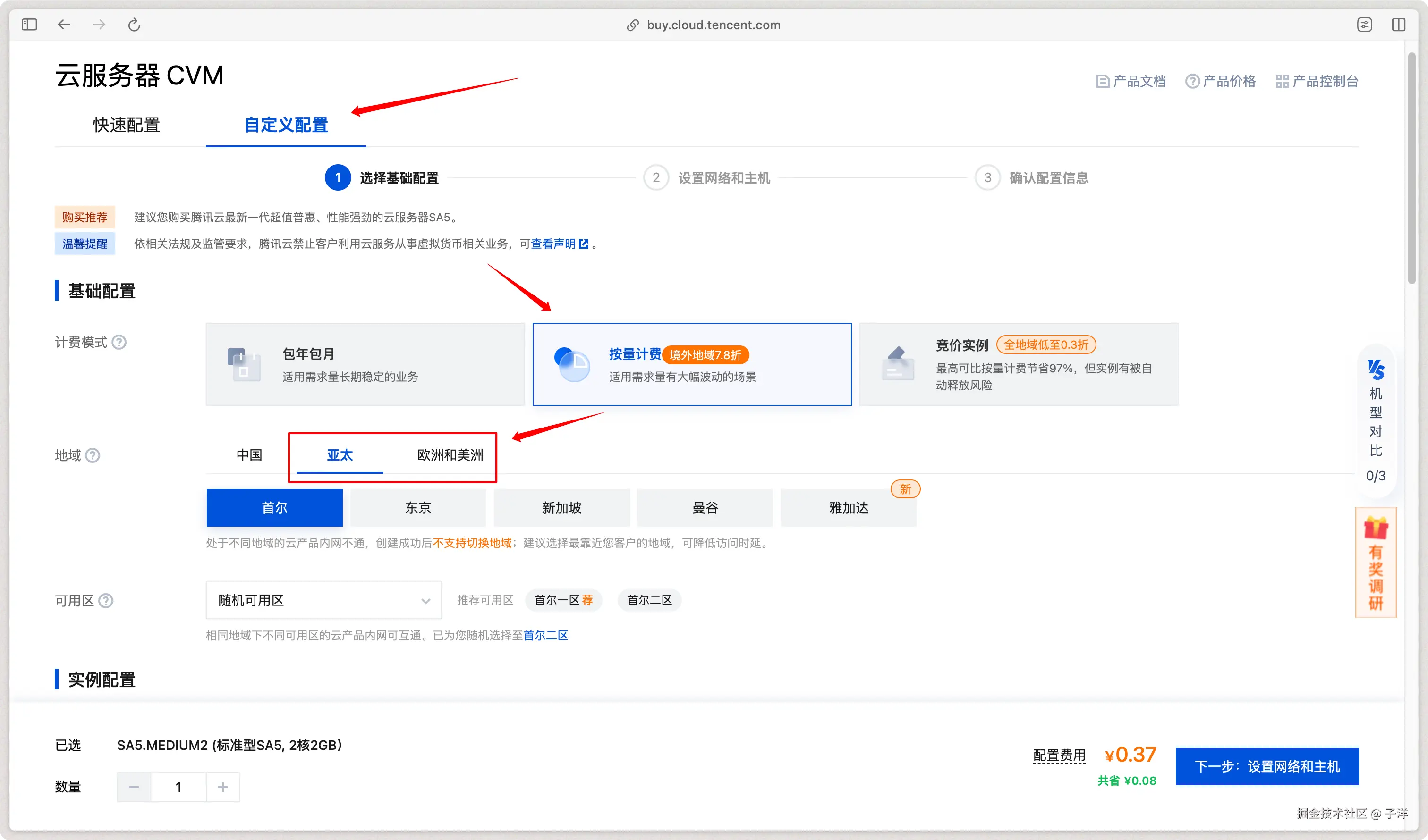 购买虚拟机时,建议选择“自定义配置”模式,这样可以自由调整按量计费的选项以及服务器所在的地区。