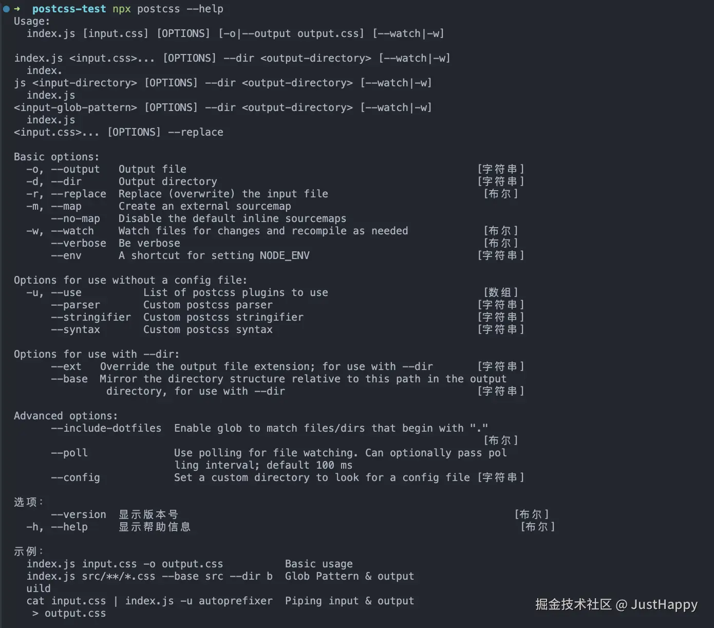 我们安装了PostCss的Cli(脚手架)可以先执行 npx postcss --help查看一下命令