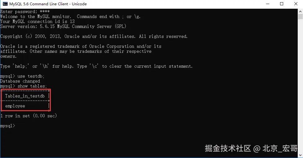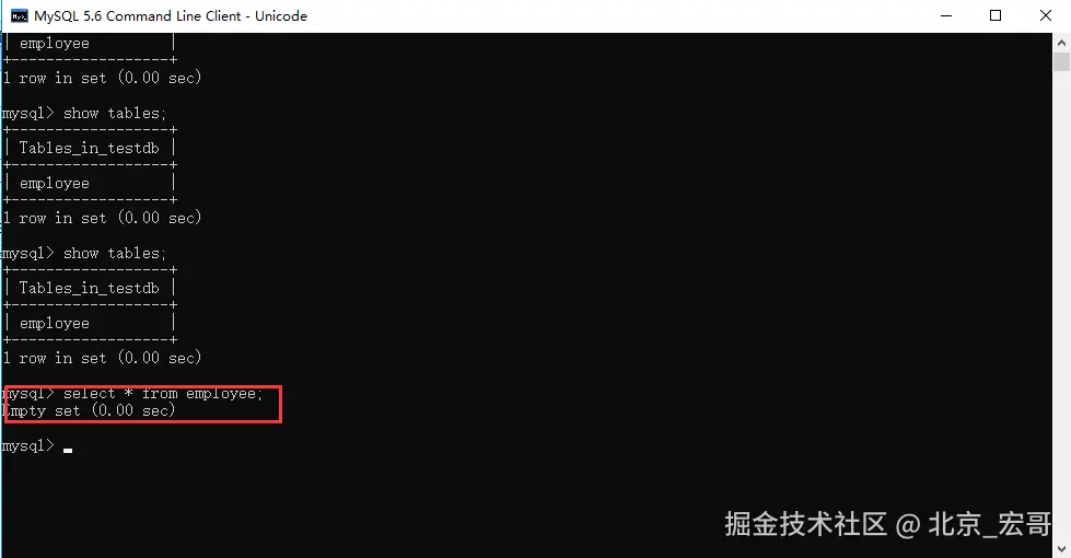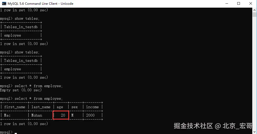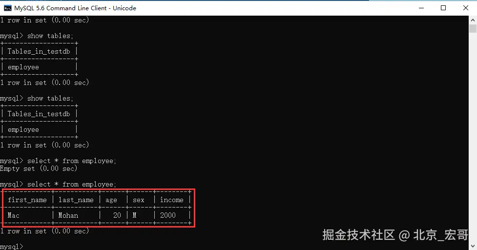 - 在TESTDB数据库中您已经创建了表 EMPLOYEE(测试用的测试表)