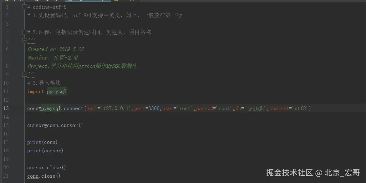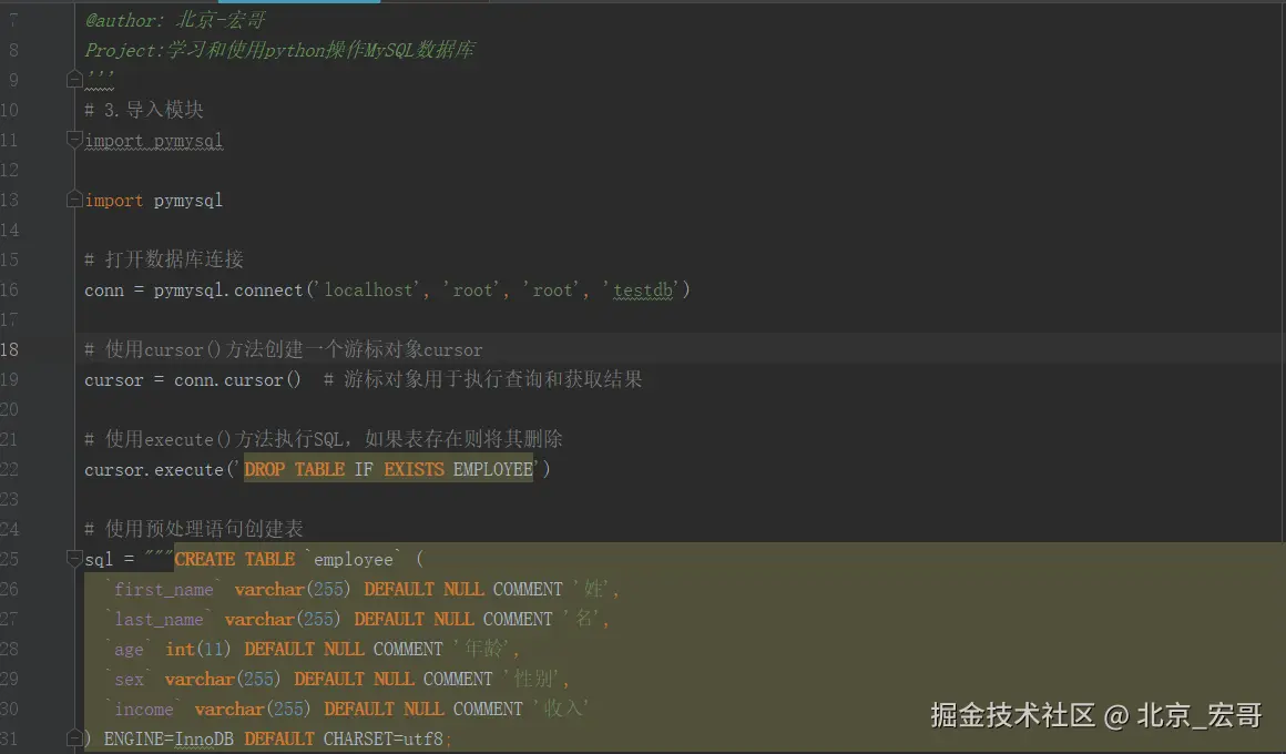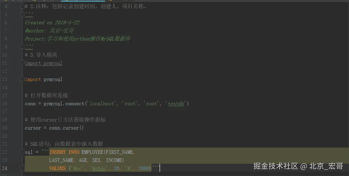 下面将以具体代码的形式依次介绍python中如何实现对MySQL数据库的增删改查等操作。
