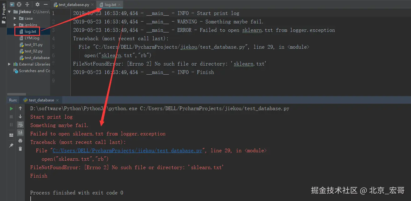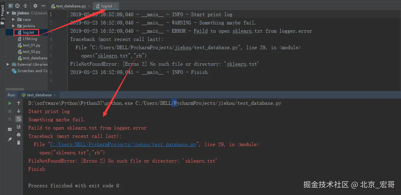 也可以使用logger.exception(msg,_args),它等价于logger.error(msg,exc_info = True,_args),所以你可以将