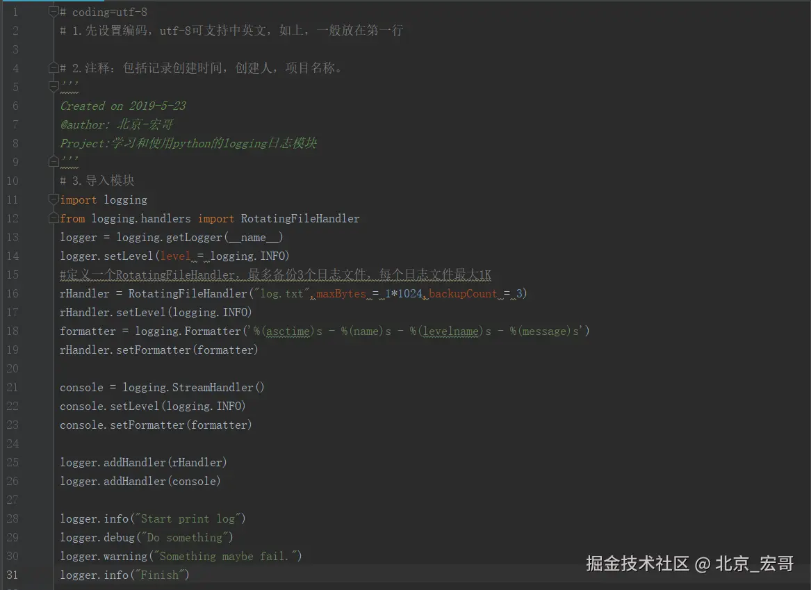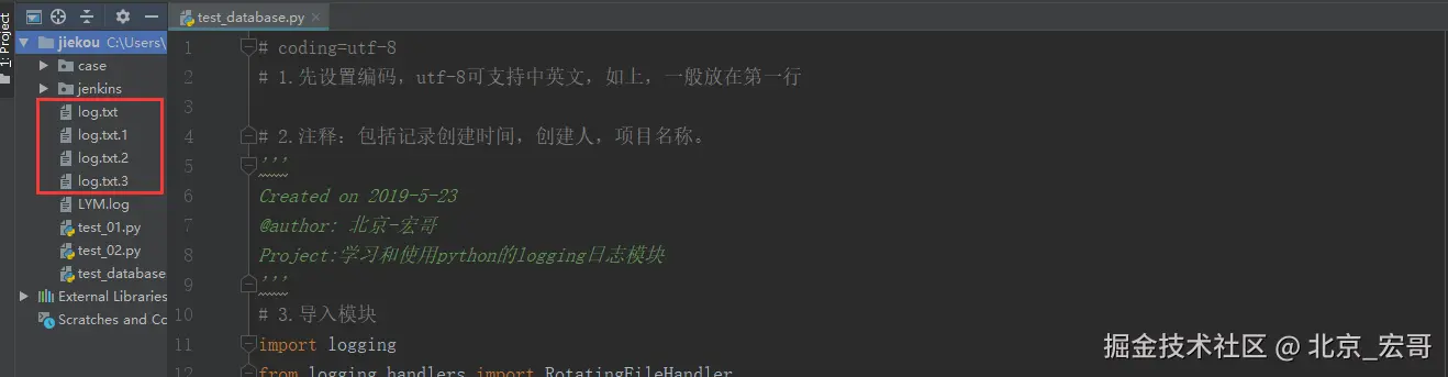 其实意思就是log会写在一个文件,这个文件定义成1K大小,日志太多写不下的话,它会自动备份成log.txt.1,log.txt.2 ......,然后再创建一个log.txt开始写log。使用RotatingFileHandler,可以实现日志回滚:
