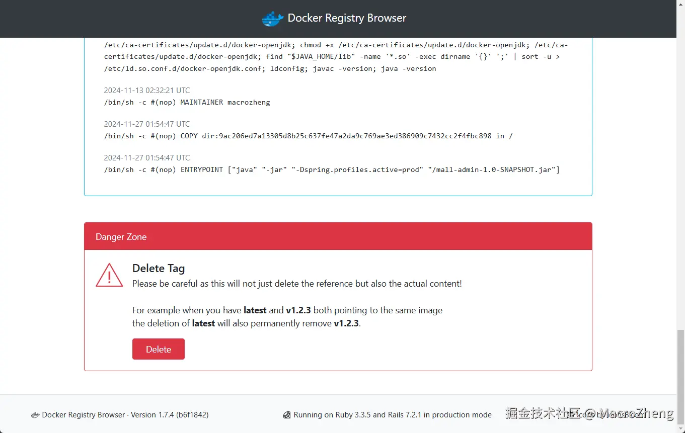 - 如果你想删除镜像的话,可以点击镜像查看详情,在最底部有删除按钮;