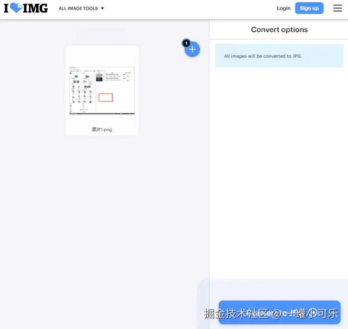 iloveIMG也是在线的图片文件处理工具,在转换图片格式方面,该网站的图片转换操作十分简单,只需选择转换jpg格式的选项,并上传png图片文件,然后点击转换按钮即可。但是该网站不支持自定义设置图片的参数。