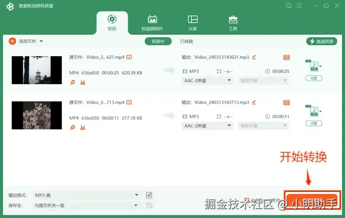 首先,我们来看看数据 蛙视频转换器。这款软件以高效、稳定的转换性能受到广大用户的喜爱。它支持多种视频格式转换为音频格式,MP4转MP3。此外,数据 蛙视频转换器还具有批量转换、高速转换、转换后音频文件保留源文件音质等优势,能够让您的转换过程更加轻松、高效、高质量,下面让我们一起来看一下该怎么用这款软件将mp4转换mp3吧。