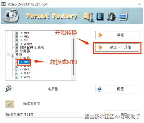 第二步: 选择【->MP3】,点击【确定->开始】按钮开始转换格式。
