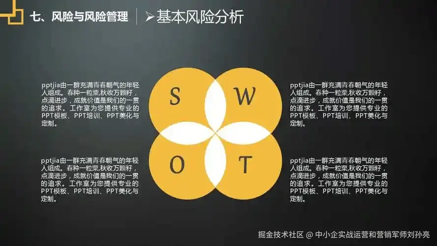 - 风险识别与评估:识别公司在运营过程中可能面临的各种风险,如市场风险(市场需求变化、竞争加剧)、技术风险(技术更新换代、技术难题)、财务风险(资金链断裂、成本超支)、管理风险(团队不稳定、决策失误)等,并对每种风险的可能性和影响程度进行评估。例如,“市场风险方面,由于智能健康手环市场竞争激烈,市场需求可能受到竞争对手新产品推出的影响而发生变化。我们评估这种风险发生的可能性为较高,一旦发生,对公司的销售和利润会产生较大的影响”。