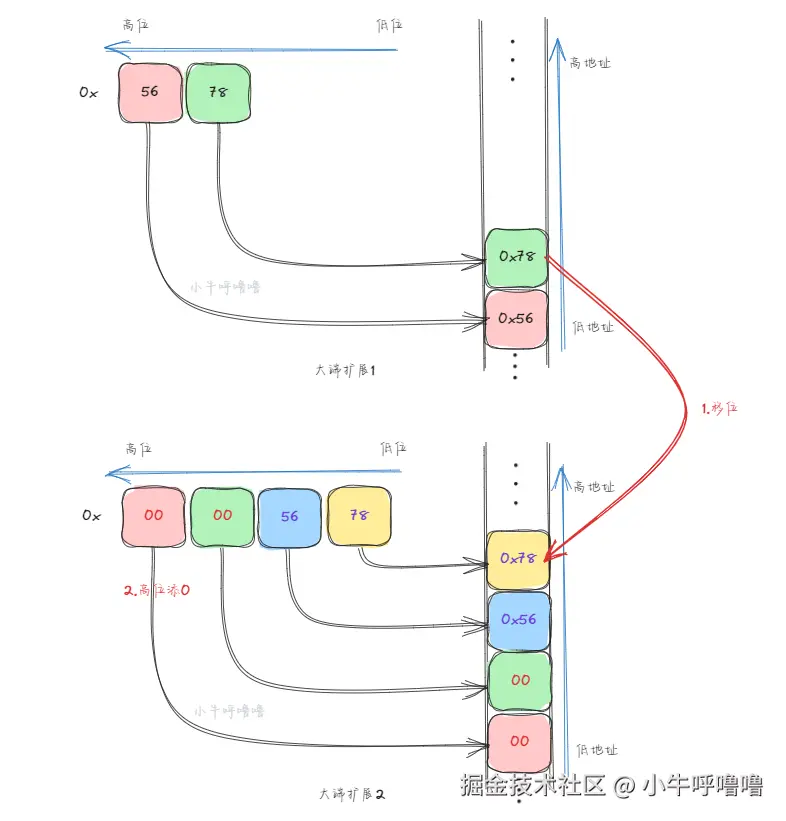 小端字节序序最大的好处是强制转换数据类型效率较高,比如小数强制转大数只需要在高位添0;如果大数强制转小数,直接将高位数据丢弃即可,不需要额外再调整宇节 而大端字节序则需要调整字节内容,移动数据
