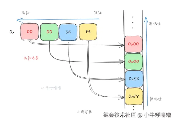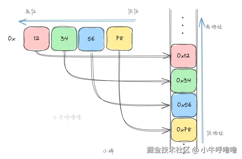 小端字节序Little-Endian:数值的低位字节存放在内存的低地址端,高位字节存放在内存的高地址端 本文这里还是以32位的数0x12345678,来举个例子 该数值,在内存中的存储顺序是: