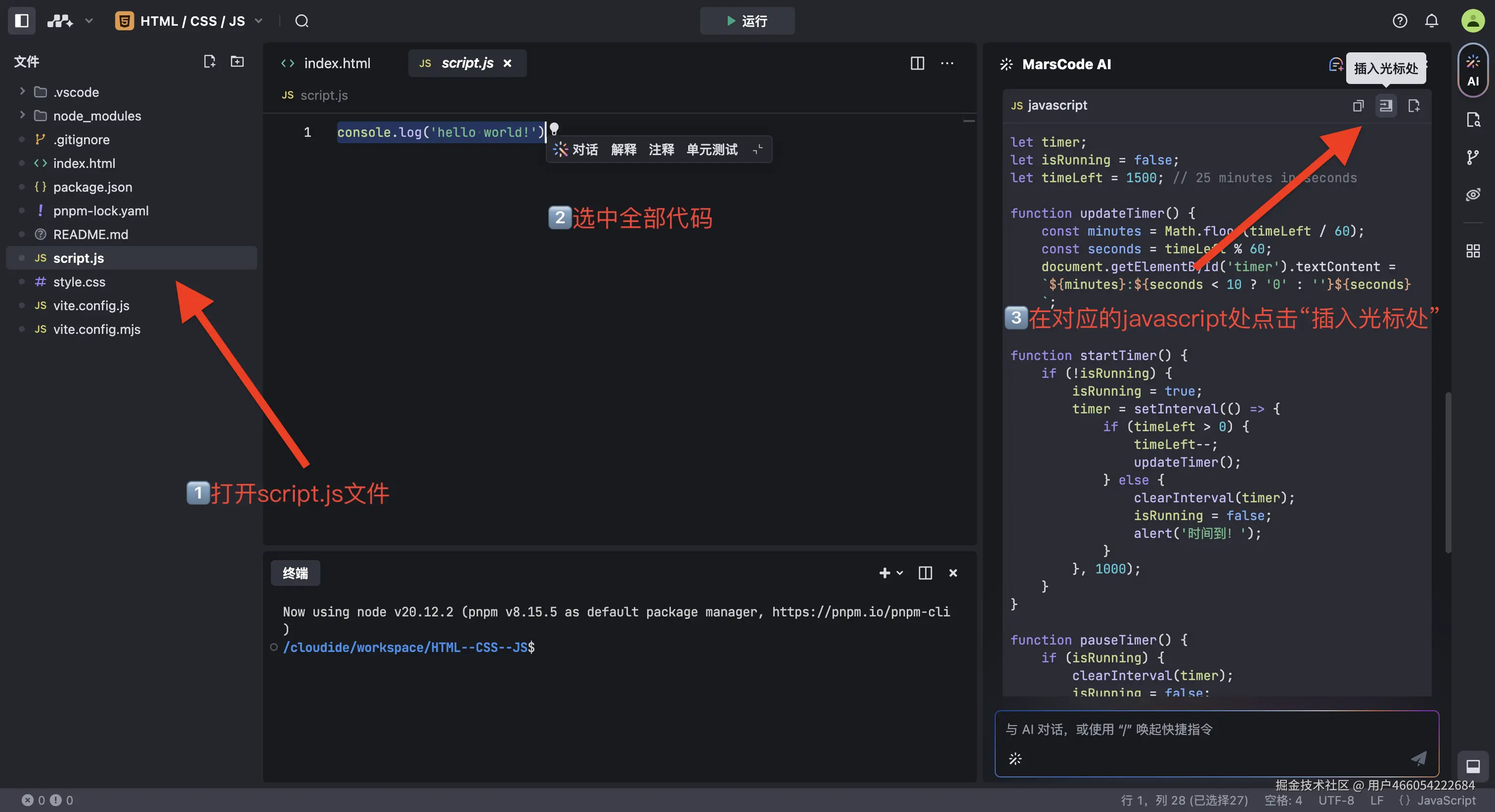 - 打开左侧 【文件浏览器】 的 script.js , 全选代码 ,找到右侧对应的 javascript文件 ,点击 插入光标处 :