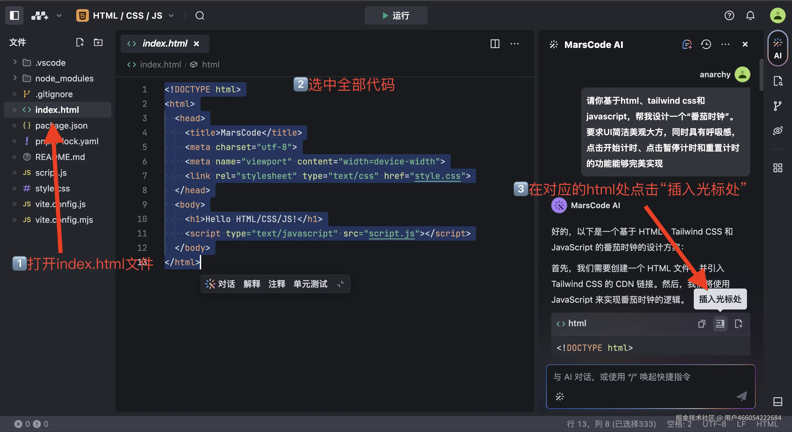 - 打开左侧 【文件浏览器】 的 index.html , 全选代码 ,找到右侧对应的 html文件 ,点击 插入光标处 :