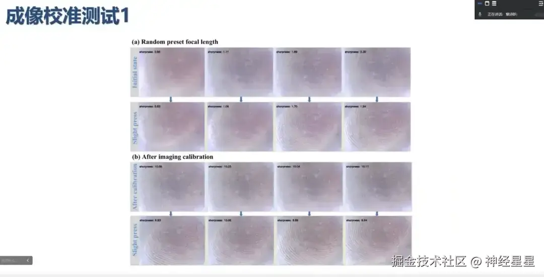 在视触觉传感中,成像距离非常小,很多都是微距成像,这种情况下,每次按压都会改变成像距离,从而导致成像偏差。此外,传感器设计时预设的成像距离与实际使用中的成像距离也可能存在差异,这两者均会导致成像清晰度不足。为了解决这些问题,我们开发了一套成像调节系统,该系统包括校准模块和调焦模块。