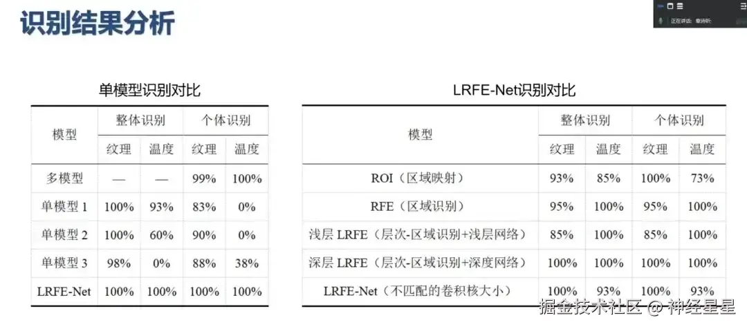 如下图所示,传统单模型未能有效处理纹理和温度信息,因此在个体识别中,温度识别准确率较低,在整体识别中,因为图像的纹理识别占主导地位,模型把不相关特征进行了强行耦合和映射,温度识别提高。而我们的机制 (LRFE-Net) 在整体识别和个体识别的持续准确率保持一致。此外,与多模型识别相比,我们的方法在时间效率上也得到了提高。