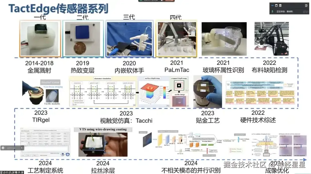 我们团队自 2014 年起开始进行视触觉传感器的研究,至今已历经 10 年时间。在此期间,我们探索并发展了多代传感器技术,并将其称为一种前沿的触觉技术 TactEdge, 如下图所示:
