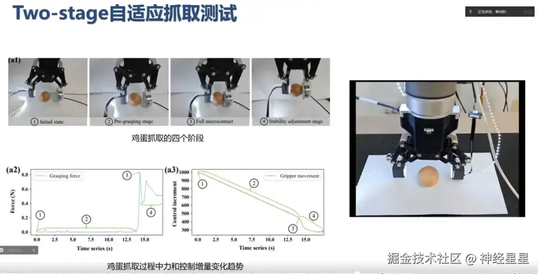 该策略可适应不同的抓取需求,比如抓取苹果、鸡蛋、海绵、罐头等。如下图所示,在鸡蛋的预抓取阶段,机械手缓慢移动以建立与物体属性的初步识别,随后,在稳定性调节阶段,由于鸡蛋重量较轻,系统仅需轻微调整即可完成抓取操作,无需过多干预。