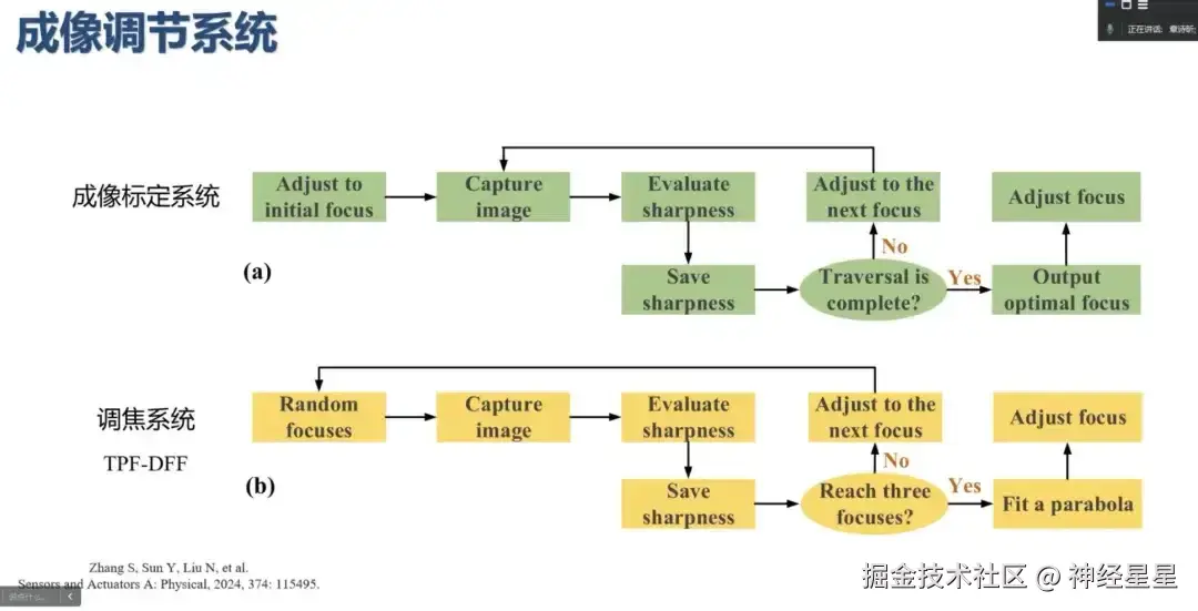 在成像调节系统中,成像校准模块采用全局搜索策略来推进调整区间并缩短调焦距离,同时帮助确定合理的调整值作为标签。调焦模块则采用了两种方法:基于三点拟合的对焦深度法、基于深度学习的离焦深度法,前者精度高但速度慢,后者速度更快但精度略低,是一种端到端的调整方法。