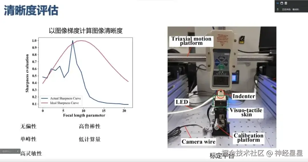鉴于视触觉传感依赖图像机制,我们主要以图像清晰度为标准进行调焦。如下图所示,理想的成像清晰度评估曲线应具有无偏性和单峰性等(红色曲线)。然而,在实际调焦环境中,光线往往不均匀(蓝色曲线),会陷入局部调焦峰值。