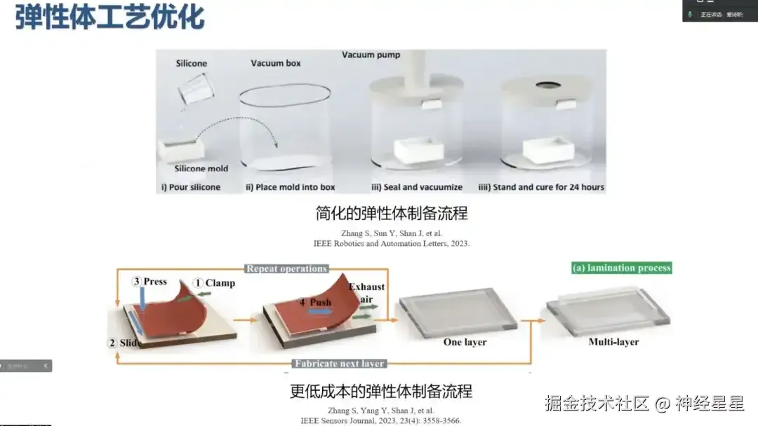 例如,弹性体常用的制备工艺包括定模、调配硅胶、浇筑、抽真空、加热和脱模,随后进入各种涂层工艺,这是一种通用的弹性体制备流程。在批量生产时,考虑到加热时间较长,可以采用自固化的特殊硅胶材料,这种材料在固化和抽真空后不需要额外加热。此外,为了降低传感器弹性体制备的成本,我们团队也提出了一种层积工艺。