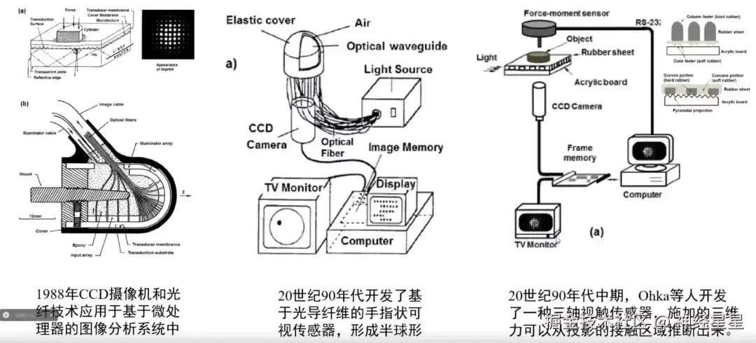 过去,人们利用电子类触觉传感器来统计触觉信息,但这类触觉传感器的传感单元分布较为稀疏,在映射触觉信息时分辨率相对较低。为了提升触觉信息的质量,研究人员引入了一种新的传感机制——基于视觉识别原理的触觉传感器(也被称为视触觉传感器),其利用图像作为传感媒介,显著提高了触觉质量,尤其是在空间分辨率方面。 视触觉类传感器的演进进程如下图所示: