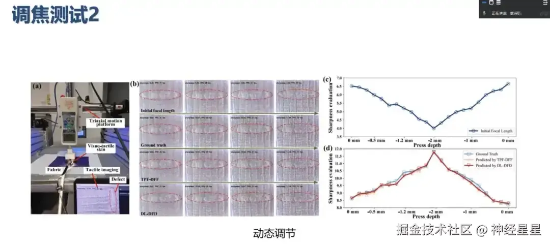 为了测试调焦精度,我们使用 3 种不同密度纹理的物体进行实验,结果显示两种校准方法均接近预期效果,成像调整准确率可达 99.5% 以上,并能在动态识别任务中实时调焦。