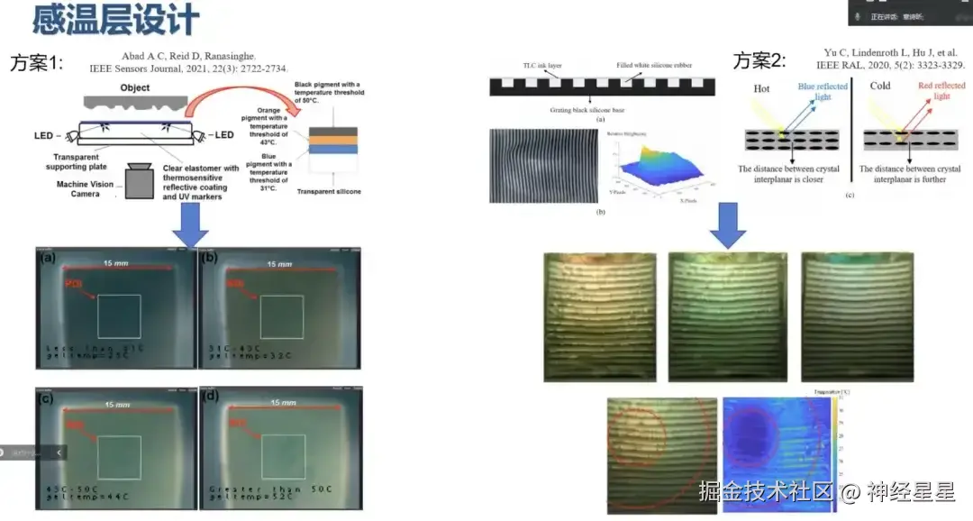 第二代 TactEdge 在涂层或者标记材料中添加了热致变材料, 因为每种材料具有不同的温度阈值,可以在温度升高或降低的情况下,看到由浅至深的颜色变化,以此获得局部温度感知。