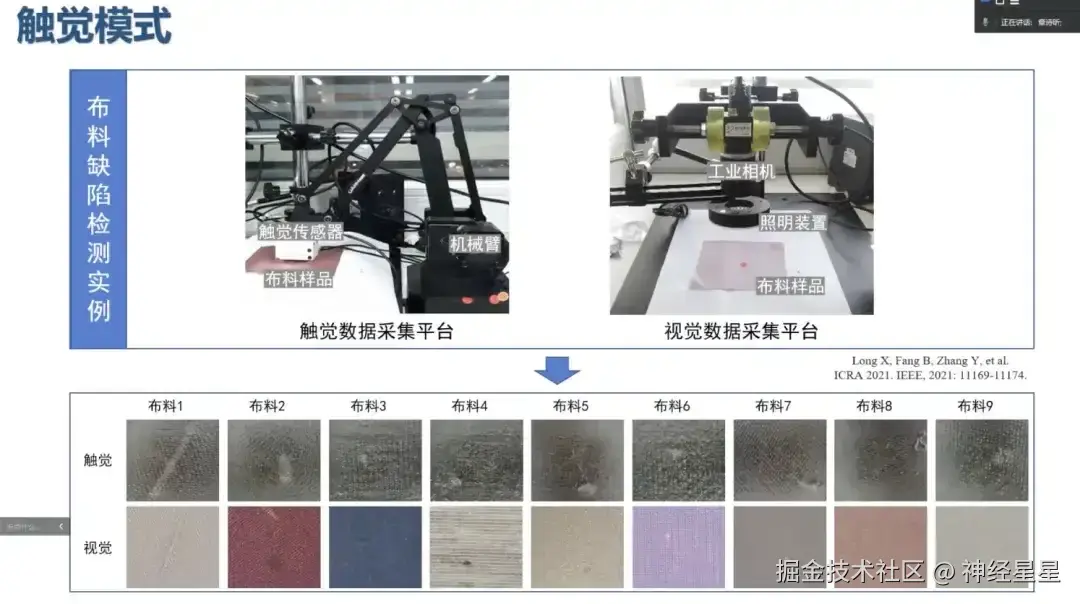织物缺陷检测至关重要,其缺陷会导致价值降低 45%—65%。布料染色花纹会严重影响算法的通用性和复杂程度,触觉作为人类重要的感知能力之一,不受物体表面颜色的影响,可以辅助视觉来帮助我们感知物体。因此,我们把触觉引入织物缺陷检测,并利用 9 种布料样本进行交叉验证。结果显示,触觉模式下的识别准确率高于视觉模式,特别是对于某些特殊纹理的识别。