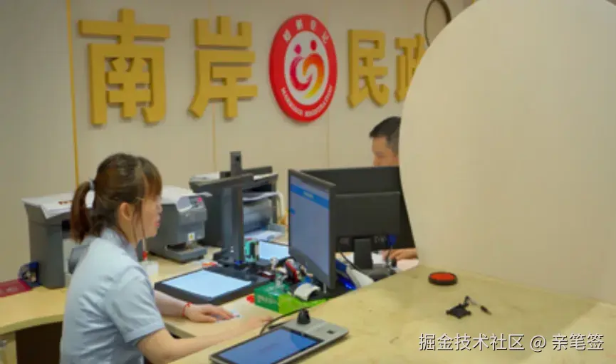 以往需要手动填写和核对新人的基本信息、在纸上确认签名捺印,耗时往往需要半小时以上。而引入电子签名及印章能力之后,工作人员可以通过设备直接生成需签署的电子文件,新人通过签字设备阅读需签署的文件,在电子签名板上进行1次签名捺印,即可完成《结婚登记审查处理表》、《申请结婚登记声明书》、《婚姻登记个人信用风险告知书》、《结婚登记告知单》等所有文件的签署,极大简化了传统婚姻登记的繁琐流程。
