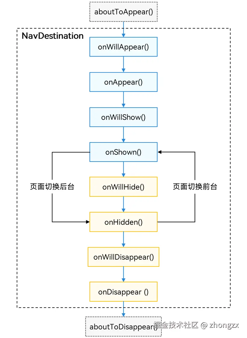 下面插入Navigation的生命周期流程图,HMRouter的生命周期流程类似,在此基础上增加了额外的生命周期流程。