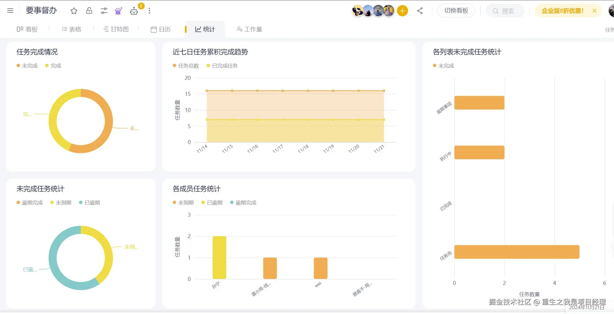 - 团队工作量分析:通过不同颜色的柱状图,管理者可以查看各个团队成员的工作量分布,确保资源合理分配