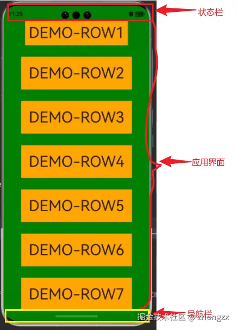 在鸿蒙应用中,全屏UI元素分为状态栏、应用界面和导航栏。