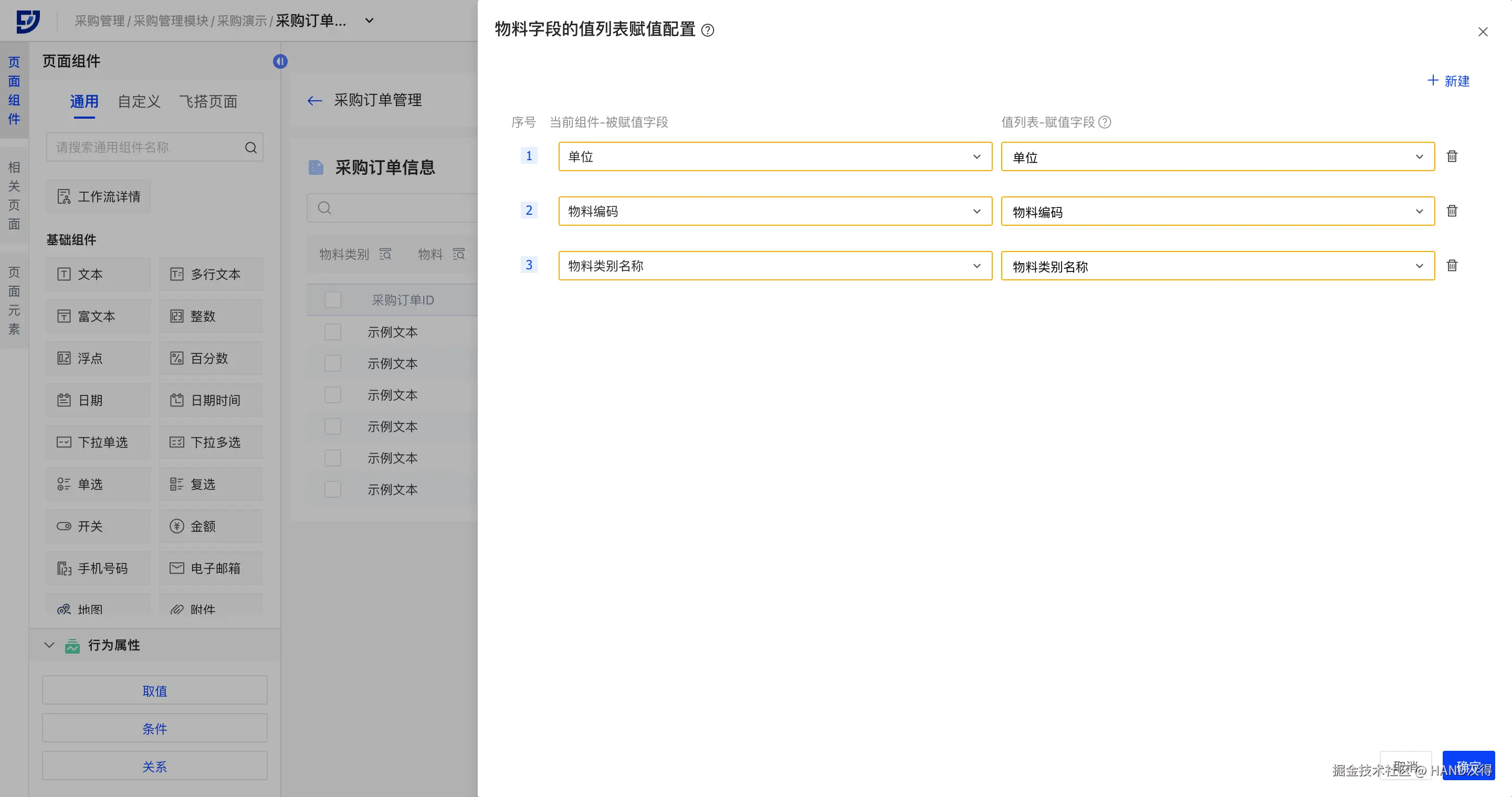 选择采购订单信息列表中的物料字段,点击值列表赋值配置按钮,打开配置弹窗。