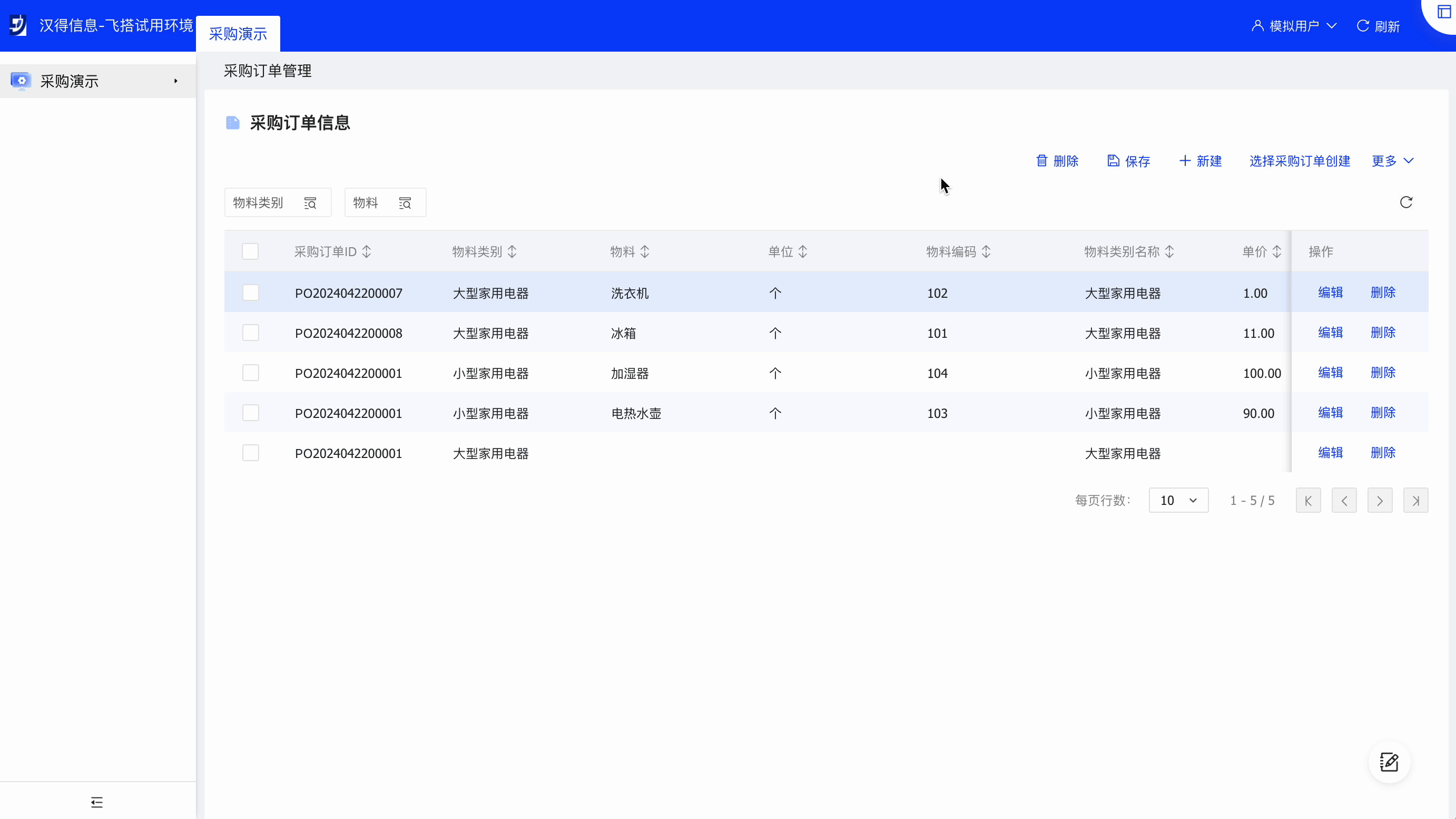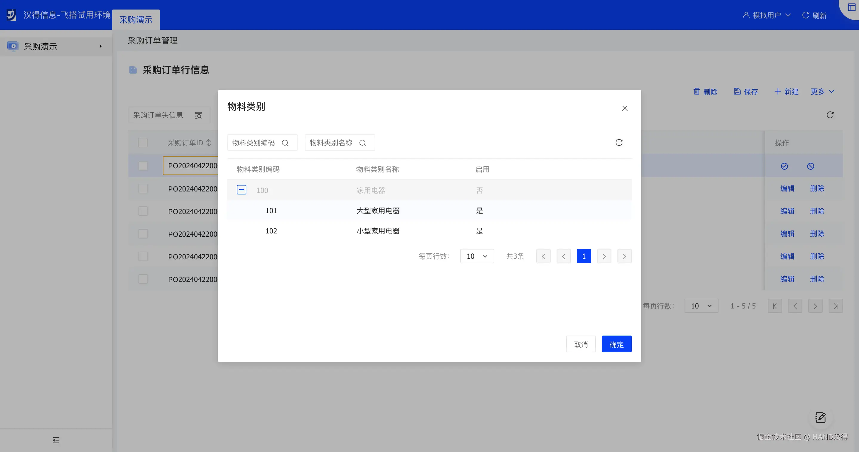 采购管理场景中,采购订单关联物料分类、物料,创建编辑采购订单时,用户可以通过打开物料分类、物料字段的值列表弹窗进行物料分类、物料的数据选择,并通过物料分类数据范围筛选限制物料字段的所选范围。