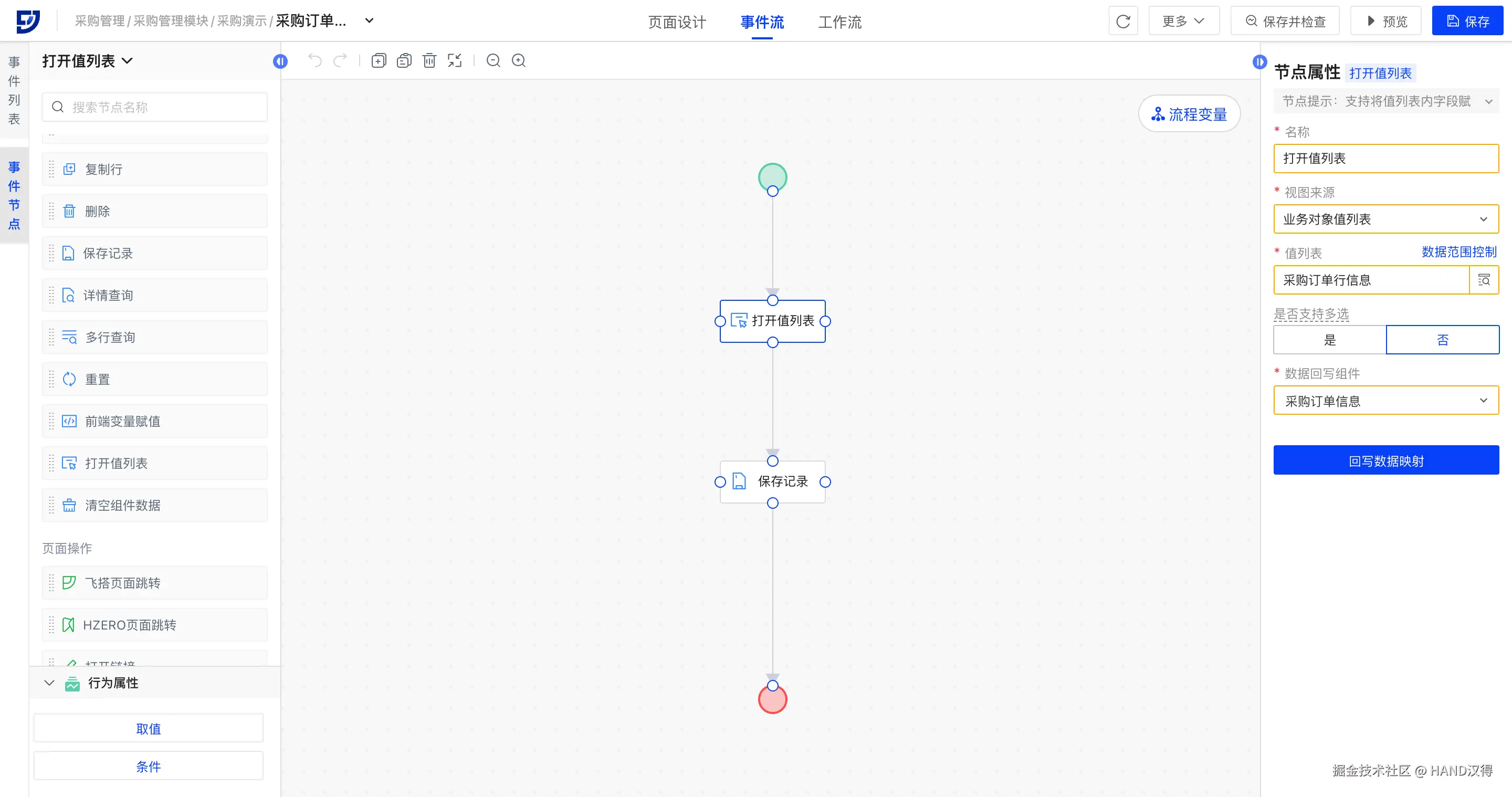 将打开值列表节点与保存记录节点组合使用,并将该事件流配置至 <选择采购订单创建> 按钮,可实现打开采购订单信息值列表并将选择的值数据新建保存至当前列表的操作。