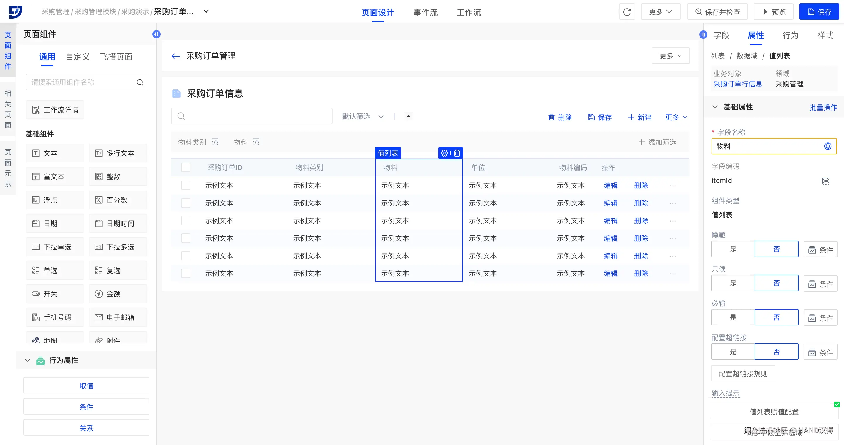 值列表组件支持将关联对象的字段的值赋值储存至当前组件的字段上进行使用。在采购管理场景中,可以将物料值列表中的单位、物料编码、物料类别名称字段赋值给当前采购管理列表上的单位、物料编码、物料类别名称字段进行显示与存储。